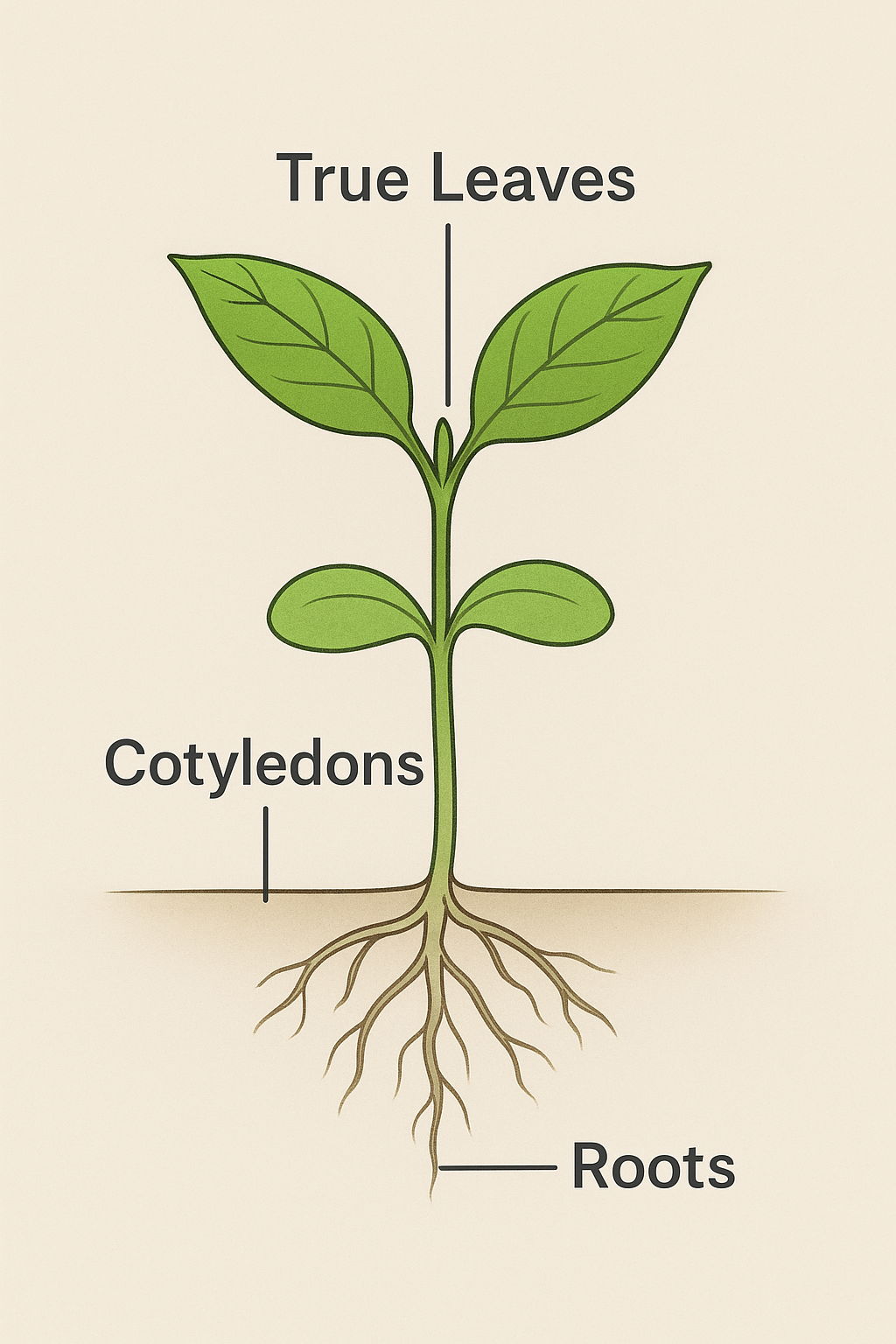 • True leaves look more like the adult plant’s leaves, while cotyledons are smooth and rounded.